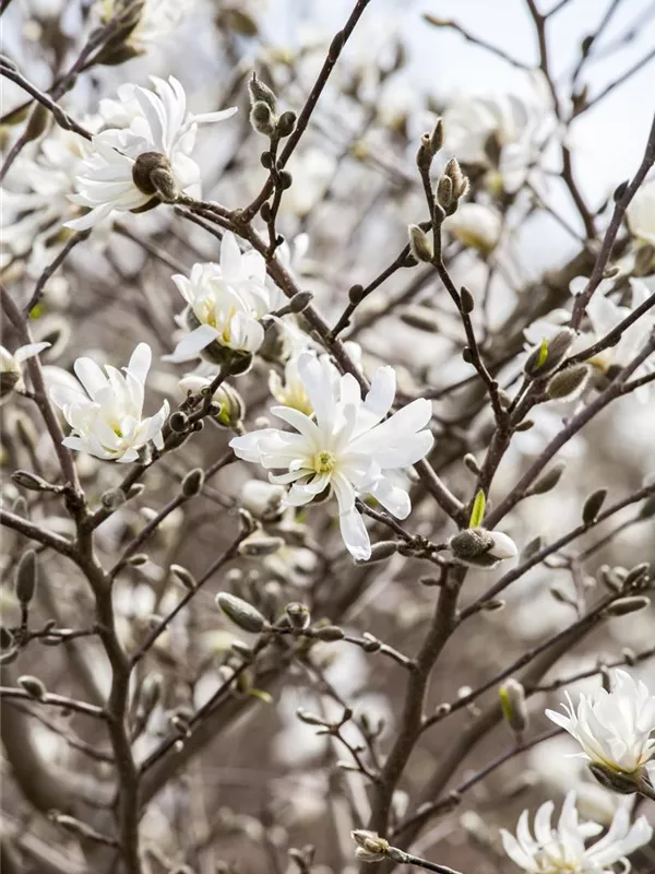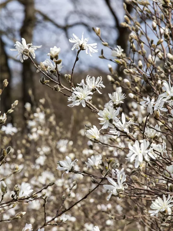 Die Sternmagnolie (Magnolia stellata) ist ein Strauch, der weiße, sternförmige Blüten mit einem angenehmen Duft hervorbringt. Sie erscheinen von März bis April. Ihre Rinde ist grau, glatt.