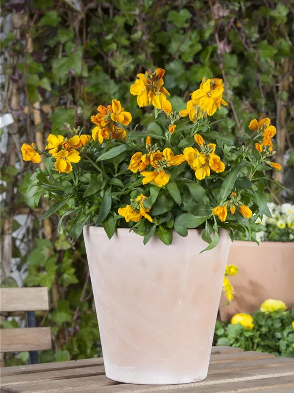 Der Goldlack (Erysimum cheiri) ist eine aufrechte Staude, die von Juli bis August gelbe, orangefarbene, rote Blüten mit einem starken Duft bildet. An einem sonnigen Standort mit durchlässigem Boden erreicht er gewöhnlich eine Höhe von ca. 1 m und wird ca. 60 cm breit. Der Goldlack ist an geschützten Standorten gut frostverträglich.