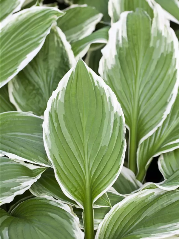Hoher Blattschmuckwert. Die sommergrünen Blätter der Kleine Siebolds Funkie sind mittelgrün, lanzettlich, grundständig, ganzrandig und weisen einen weißen Rand auf.