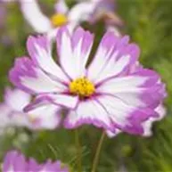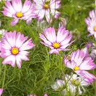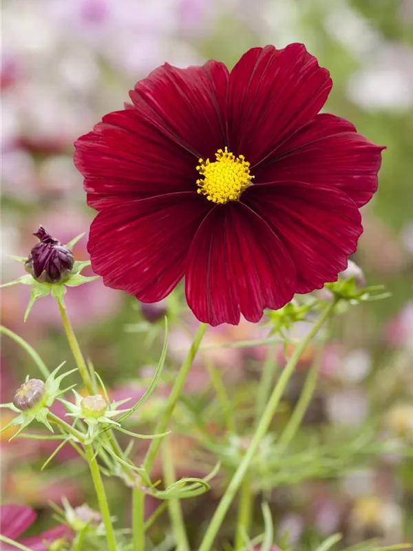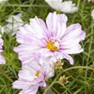Das Fiederblättrige Schmuckkörbchen (Cosmos bipinnatus) ist eine beliebte Pflanze für den Balkon, die während der gesamten Saison unzählige weiße, rosafarbene, rote Blüten bildet. Die hellgrünen Blätter sind gefiedert. Ein sonniger Standort und ein durchlässiges Substrat werden bevorzugt.