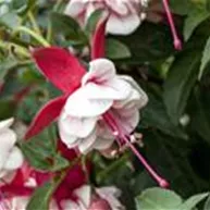 Fuchsia 'Jollies'® bildet während der gesamten Saison zahlreiche glockenförmige, zweifarbige Blüten.