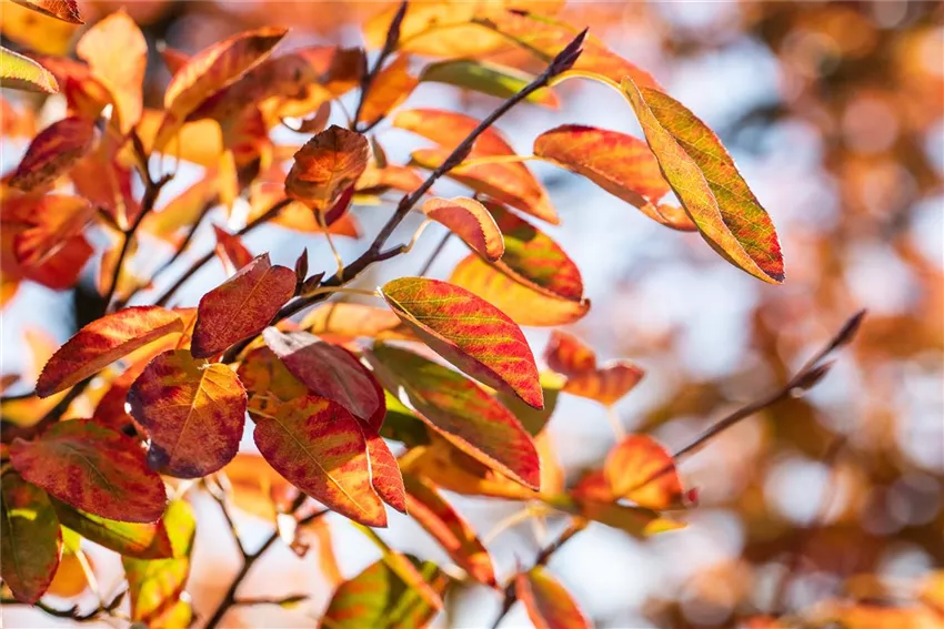 Zu den beliebtesten Gehölzen für den goldenen Herbst zählt zweifelsohne der Fächerahorn. Ihn gibt es in den unterschiedlichsten Sorten, Formen und Farben. Besonders beliebt ist der Japanische Fächerahorn, der im Herbst mit seinen tiefroten Blättern für farbliche Akzente sorgt. Aber auch andere Sorten können sich sehen lassen und zeigen ihre Blätter in leuchtendem Orange oder einem knalligen Gelb. Vor allein ein Ahorn ist bei vielen mit einem großen Garten sehr beliebt, da der Baum sehr groß wird und dann im Herbst über allen anderen Gehölzen mit seinem bunten Laub ragt. Außerdem beliebt ist die Kuperfelsenbirne. Auch sie zählt zu den beliebtesten Gehölzen für den goldenen Herbst und macht mit ihren Blättern zum Ende der Gartensaison auf sich aufmerksam. Aber auch in den anderen Jahreszeiten kann sie sich sehen lassen und zählt damit zu den Vierjahreszeiten-Gehölzen. Im Frühjahr treiben die Blätter in wunderschönen kupferfarben aus, ab April zeigen sich wunderschöne Blüten, aus denen sich im Sommer blaue Beeren entwickeln und im Herbst kommen dann die Blätter in einem leuchtenden Gelb-Orange ins Spiel.